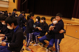 途中には、5年生が考えたゲームもはさみ、みんなで楽しみました。最後には、6年生のこの1年間の行事や各学年との交流の様子を写真で楽しみ、くす玉割りも行いました。