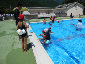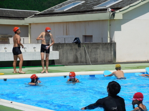 今日は、水泳教室2日目でした。みんな全員出席で、がんばりました。少しずつですが、泳ぐ距離も上がったり、息つぎも上手にできるようになりました。夏休み中、地区水泳もあると思いますのでがんばって練習しましょう。