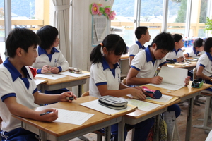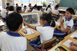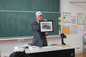 6年生は、5時間目に東市場の上山孝さんをお招きして、戦争中の事について話を聞きました。上山さんは、神戸小学校出身で、この学校がまだ木造の古い校舎だった頃、通っておられました。そんな昔の神戸の様子も交えながら、今から70年以上前になりますが、戦争中に予科練に入られて、特攻として終戦を迎えられた話をしていただきました。子どもたちにとって戦争は遠い話になってしまいましたが、実際の体験談は心にせまるものがあったと思います。もう80歳を超えられていますが、とてもお元気で、子どもたちに、人間いつも前向きな姿勢であることも教えてくださったようにも思います。本当にありがとうございました。 | | | | |