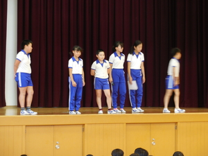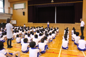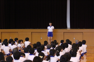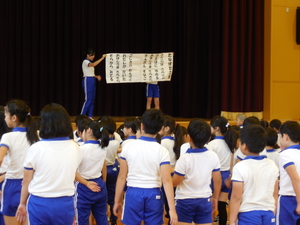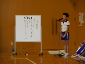 |   | |  | | 平成29年度 トピックス 今日は、臨時の児童朝会で、七夕集会を開きました。この会に先立って、各学年でお願い事を書いた短冊を子どもたちの下駄箱のある玄関に掲示しました。一人一人の思いを見ることができますので、学校へ来られた際には、玄関で是非ご覧ください。 さて、七夕集会は、5・6年生のリーダーズ委員会を中心に計画してくれました。まずはじめに6年生が代表であいさつをして、七夕の由来の劇をしてくれました。織り姫と彦星の話ですが、天の川が雨で水かさが増すと、会えないので、カササギが橋渡しをしてくれるといった言い伝えもみんなに教えてくれました。そして、みんなで「たなばたさま」の歌を歌いました。