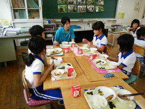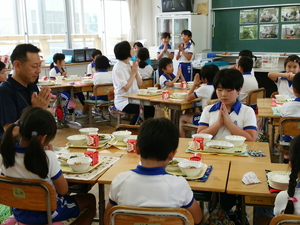 今日は、ふれあい給食が3年生で行われました。これで、全ての学年でふれあい給食を実施しました。今日の給食は、鮎の塩焼きやブルーベリーなど、ふるさと献立の給食で、全てが、兵庫県で取られたものばかりです。地元のものを使い、地元のものを食べる(地産地消といいます)ことから食育について考える日でもあります。子どもたちは色々と質問もして、今日の鮎は、揖保川漁協の方から提供いただいたこともお聞きしました。鮎は頭から食べられるということで、おいしく全部食べている子も多くいたそうです。給食センターの調理員のみなさんどうもありがとうございました。