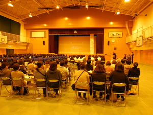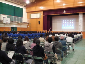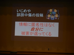その後は、小学生高学年と中学生が一堂に会して、保護者地域の方とともに、スマホやネットに潜むキケンと題して、嶋田亜紀先生に講演をしていただきました。スマホやネットというと何のことと思う人も多いと思いますが、実際子どもたちの方が知識は豊富でありました。しかし、その影に潜む危険や罠については知らないことがとても多く、それで子どもたちが大変な被害に遭う危険を持っているということがよく分かりました。使わない(使わせない)ではなく、決まりを守って安全に活用することが大事であるということです。宍粟市の中学校では共通ルールを決めているようです。会場の都合もあり1~4年生は聞けませんでしたが、低学年でも気をつけなければならないと思いました。会の終わりには、スマホでの安全なラインの設定の仕方についても教えていただき、会場の皆さんがスマホ片手に聴き入りました。