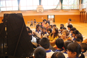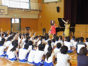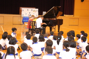 今日は、ふれあいコンサートが行われました。毎年、西兵庫信用金庫と山崎文化会館の協賛で宍粟市内の各小学校で行われている恒例行事です。子どもたちもこの時期になると音楽の生演奏の機会が持てることを楽しみにしています。 今年は、デュエットウのお二人のピアノ連弾を鑑賞しました。低学年と高学年に分けて、2回公演をしていただきました。 デュエットウのお二人は、幼い頃からのお友達でとても仲よく、一緒に活動をされています。子どもたちに耳慣れたクラシックから願いの叶う曲や宍粟をイメージしたオリジナル曲も披露してくださいました。また、ミニピアノの超高速技巧や学校の先生を入れてのトリオ演奏など、楽しいおしゃべりの中で、子どもたちの気持ちを引きつけながら、上手にすすめてくださいました。本当に楽しいひとときをありがとうございました。