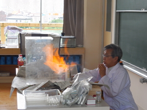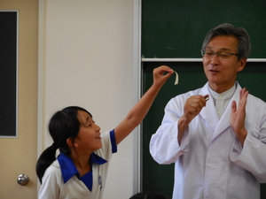 午後から宍粟市が開催している「理科おもしろ実験授業」がありました。これは市内の5年生対象に行われているもので、神戸にある大学の栗岡先生が、子どもたちのために理科の興味深い実験を演示して下さったり、参加させて下さったりするものです。染河内小学校の5年生も一緒に授業を受けました。いろいろな実験をさせてもらったり見たりしましたが、化学の創る・調べる・量に着目して話も軽快に行われて、子どもたちもその話術に時間も忘れて楽しみました。栗岡先生ありがとうございました。