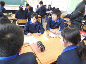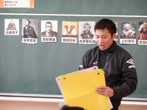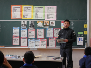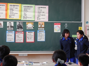 さて、昼からは、一宮南中学校の上畑先生の来ていただいて、6年生で社会科の授業をおこなってもらいました。歴史上の人物について班で人物分析をおこない発表する授業でした。中学校での授業の進め方である、『協同学習』も取り入れながら楽しく進めていただきました。子どもたちもとっても楽しい勉強だったと話していました。中学校での授業が、また楽しみになったことと思います。上畑先生ありがとうございました。