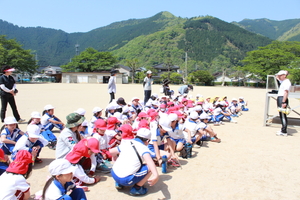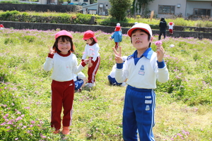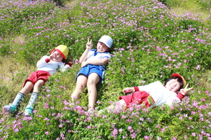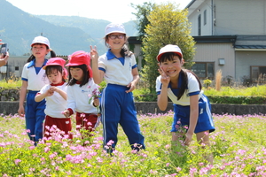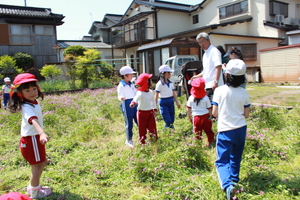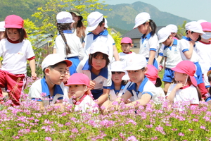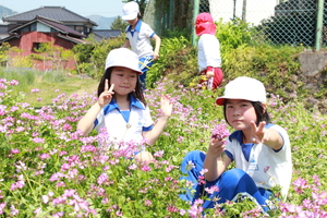 大型連休が始まりましたが、いいお天気にも恵まれて初夏のような暑さになってきました。5月1日は八十八夜でしたが、向上の道の茶の木も新芽が青々と育っています。 学校が借りている田んぼも、今やレンゲの花の真っ盛りです。去年の11月に、前の1・2年生と幼稚園の子どもたちでまいたレンゲが大きく育って花を咲かせたのです。そこで、今日は今の幼稚園児を招待して1・2年生が「レンゲ祭り」を行いました。小学生が幼稚園の子どもたちを連れて田んぼへと一緒に出かけました。