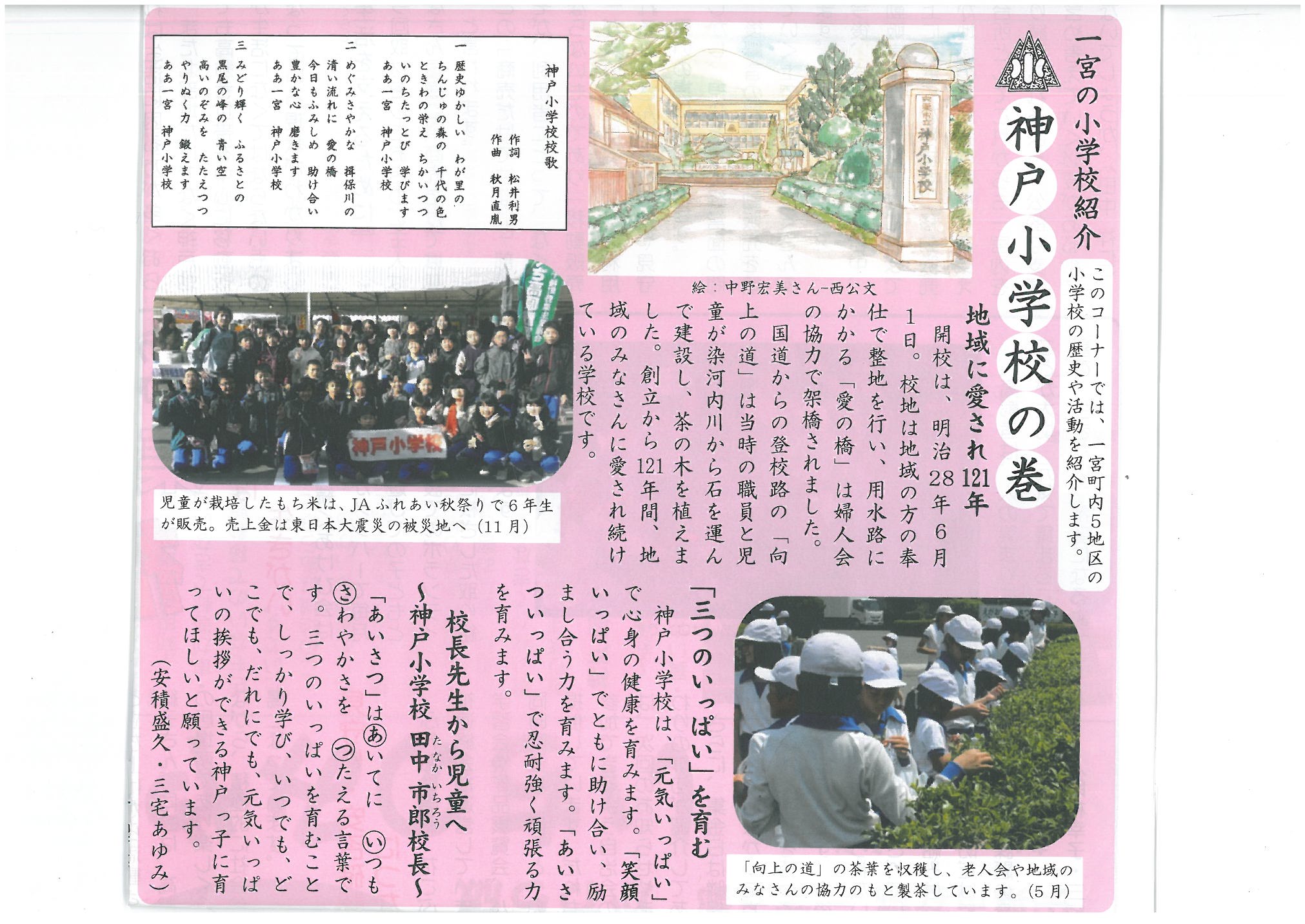|   | |  | | 平成29年度 トピックス 早いもので、今日から11月です。先月末にはお年玉付き年賀ハガキも売り出され、今年もあと2ヶ月になりました。 ところで、宍粟市の社会福祉協議会の一宮支部が作られているかわら版「 i LOVE いちのみや 」がありますが、その中のコーナーで、一宮の小学校紹介があります。毎回、一宮市民局管内の小学校の様子をお知らせしてくれていますが、先月に出された第8号で神戸小学校が紹介されました。神戸小学校の紹介でこのシリーズは最終回になるそうですが、ホームページでも紹介させていただきます。掲載ありがとうございました。