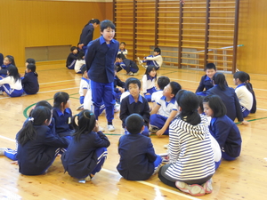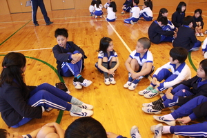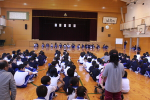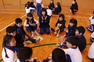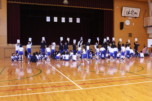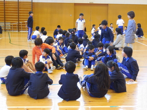 今日は、入学式から初めて全校児童172名が1人の欠席もなくそろいました。誰もが病気やケガもなく、そろったことはとってもうれしいことです。その172名全員がそろった中で、今日は縦割り班がスタートしました。本校では、1年生から6年生までが、16班に分かれて、各班10人ぐらいでいろいろな活動をしています。例えば、縦割り班で遊んだり、一緒にそうじをしたり、畑で作った物を収穫をしたりというふうにです。今度、新入生歓迎遠足も予定していますが、その時もこの班で行われます。この出会いの式も6年生のみんなが工夫して考えてくれました。とっても楽しくて温かい出会いの式となりました。そして、班のメンバーが体育館で初めて顔を合わせて、自己紹介をしました。これから仲よく活動していきましょう。