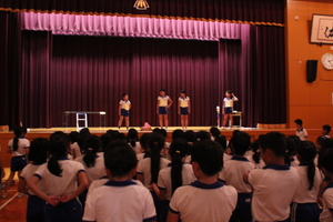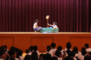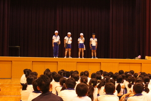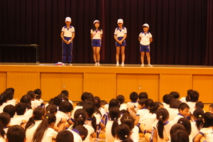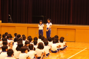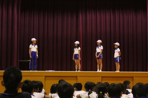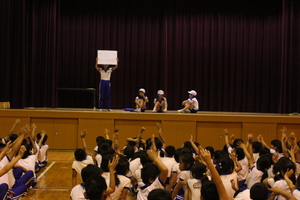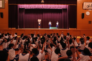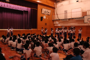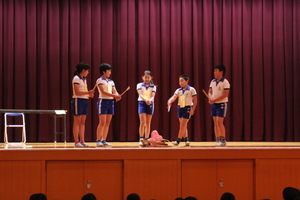 |   | |  | | 平成29年度 トピックス 先日の参観日に、5年生が自然学校の発表会をお家の方の見ていただいているところで行いました。一生懸命がんばって発表を劇のように仕立てて、楽しんで見てもらえるように工夫しました。そこで、来年自然学校に行く4年生のみんなにも自然学校の様子を知ってもらうことも兼ねて、見てもらったらどうだろうかということで、28日に5時間目に子どもたちを対象として自然学校発表会を体育館で催すことにしました。最初は、4年生だけを対象としていましたが、どの学年も5年生の発表が見て見たいということで、全校生を対象になりました。 5年生の子どもたちは、体育館で全校生を対象に行うということで緊張もしたようですが、堂々と会場のみんなも盛り上げながらがんばりました。きっと4年生のみんなも来年の自然学校がとても楽しみになったことと思います。