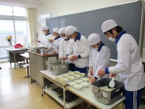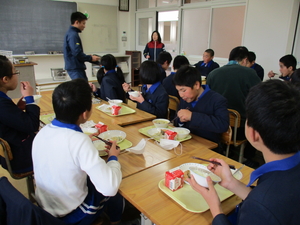 給食は、染河内小学校のみんなと、中学校の上畑先生や久保先生と一緒に2つの教室に別れて食べました。