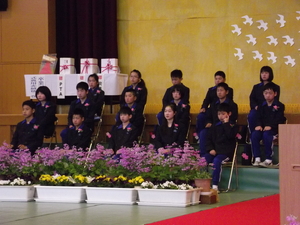 穏やかな天候で、暖かな日ざしのもと、第121回卒業証書授与式の日となりました。学校にやって来る卒業生たちは、どの子どもたちもいい顔で登校しました。5年生が卒業生に胸花をつけてくれて、式が始まるまで教室で担任の先生と話をして過ごしました。 式場には、教育委員会の学校教育課課長様をはじめ、多くのご来賓の方々にご臨席を賜りました。本当にありがとうございました。式は、厳粛な中にも温かな雰囲気のもと行われていきました。そして、在校生のお祝いの呼びかけや卒業生のお別れの呼びかけがあり、卒業生の『最後のチャイム』の合唱が感動的でした。また、卒業生の将来の夢を一人一人の言葉で聞くこともできました。中学校へ進学しても自分の夢に向かって頑張ってくれることを祈っています。 最後になりましたが、保護者の皆様には、6年間、本校の教育にご支援、ご協力いただき誠にありがとうございました。心よりお礼申し上げます。