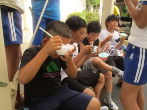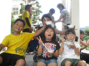 8月21日の日曜日、奉仕活動の終わったあとから、恒例の6年生の親子ふれあい活動が行われました。6年生の保護者の方にはいろいろとお世話になり本当にありがとうございました。 まずは、川遊びです。普段はプールでの水泳ですが、川での遊びを楽しみました。昔は川での水泳が一般的でしたが、今では川で泳ぐ機会が減ってきています。楽しいひとときでした。そして、帰ってきてかき氷を作ってもらい食べました。暑い中でのかき氷も最高でした。