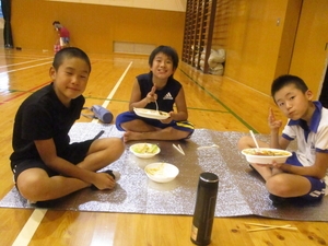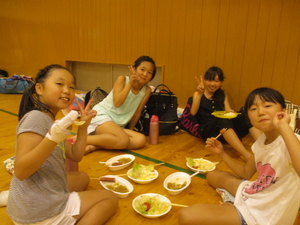 夕食は、みんなの大好きなカレーライスです。体育館でみんなと一緒に食べるカレーの味も格別です。