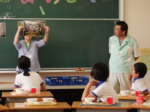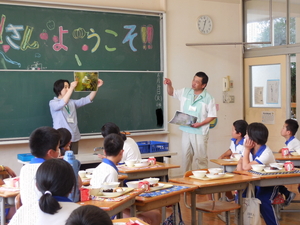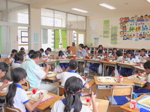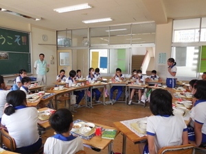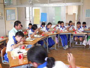 6月7日から、一宮波賀給食センターの調理員さんと栄養教諭の先生に来ていただいています。そして、各学年の教室に入っていただき、給食を一緒に食べて、給食についてのお話も聞く「ふれあい給食」の会を持っています。 今日は、6年生に来ていただきました。給食センターでの調理の仕事の様子などを聞いた後、一緒に輪になって給食を楽しみました。自分たちが毎日いただいている給食の様子がよく分かりました。本当にありがとうございました。