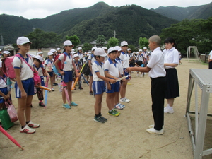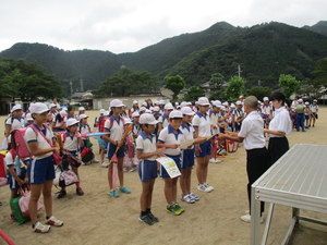 7月15日の金曜日、全校終会に一宮南中学校から生徒会長と生徒会役員の代表生徒が来てくれました。何をしに来てくれたかというと、本校と一宮南中学校は、小中一貫教育の推進をしていて、昨年度から一宮南中学校の生徒会が、登校中に大きな声であいさつができている神戸小の子どもたちを表彰してくれています。今年度も1学期間を通して、上神戸方面からと下神戸方面から大きな声で元気よくあいさつをしている2名ずつ、合計4名の子どもたちを表彰してくれました。中学校の生徒会が、小学生を表彰しに来てくれるというのは珍しい行事です。小学生も中学生のよく知っているお兄さんやお姉さんに表彰してもらえるのは嬉しいことでしょう。2学期以降も続きますので、また、がんばってほしいと思います。