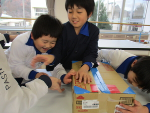 今日は、午後から児童会主催のウィンターフェスティバルが行われました。6年生を中心に学期末の忙しい時ではありましたが、休み時間や昼休みを利用して、準備に一生懸命頑張ってくれました。出し物は、「ボーリング」「キックングスナイパー」「これはなんでしょう」「紙ひこうき イン ロッカー」「まとあて」「かんつみ」「何これ音楽」「笑ってちょうだい」の8つがあり、それぞれに趣向を凝らしてお店を出してくれました。半分がお店の役、半分がお客さん役で、時間を決めて入れ替え制で行いました。 低学年から高学年まで、縦割り班で協力して、お店の説明や番をしたり、お客さん役では、低学年の子をお世話をしながら、みんなが楽しめたフェスティバルとなりました。本当に6年生のみなさん、楽しい時間を企画してくれて、ありがとう。
