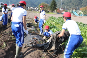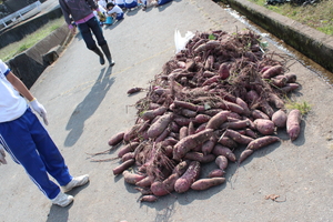 |   | |  | | 平成29年度 トピックス 今日は秋晴れのいい天気の中、いもほりを行いました。昨日放課後、先生たちで、イモのつる切り作業を行い、イモが掘りやすいようにしておきました。今日は、上神戸にある神社のお祭りの日なので、午前中の早いうちに兄弟学年で掘ることにしました。1・6年と2・5年、3・4年の組み合わせです。イモの種類は「紅はるか」と言われる品種です。まず、マルチを高学年が外し、そこからイモほり開始です。今年も、大きないもがたくさん取れました。なかには、大根くらいのイモもあったそうです。今日は全校児童一人に付き、2個くらい持って帰ることになりました。イモほりの様子も聴いていただいたり、子どもたちと一緒に料理をしたりして秋の収穫をお家でも楽しんでもらえるとありがたいです。