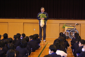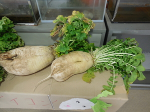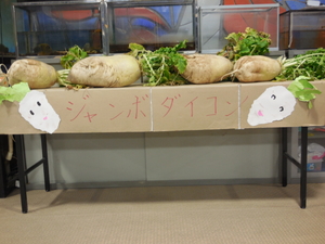 昨日の全校朝会で、校長先生が農園で取れた大根を子どもたちに紹介しました。とても大きく育っていて、先日もJAハリマが取材に来られました。こんなに大きく育つものだとびっくりしました。しばらく子ども用の玄関に展示していますので、よろしければ学校にいらした際にはご覧ください。